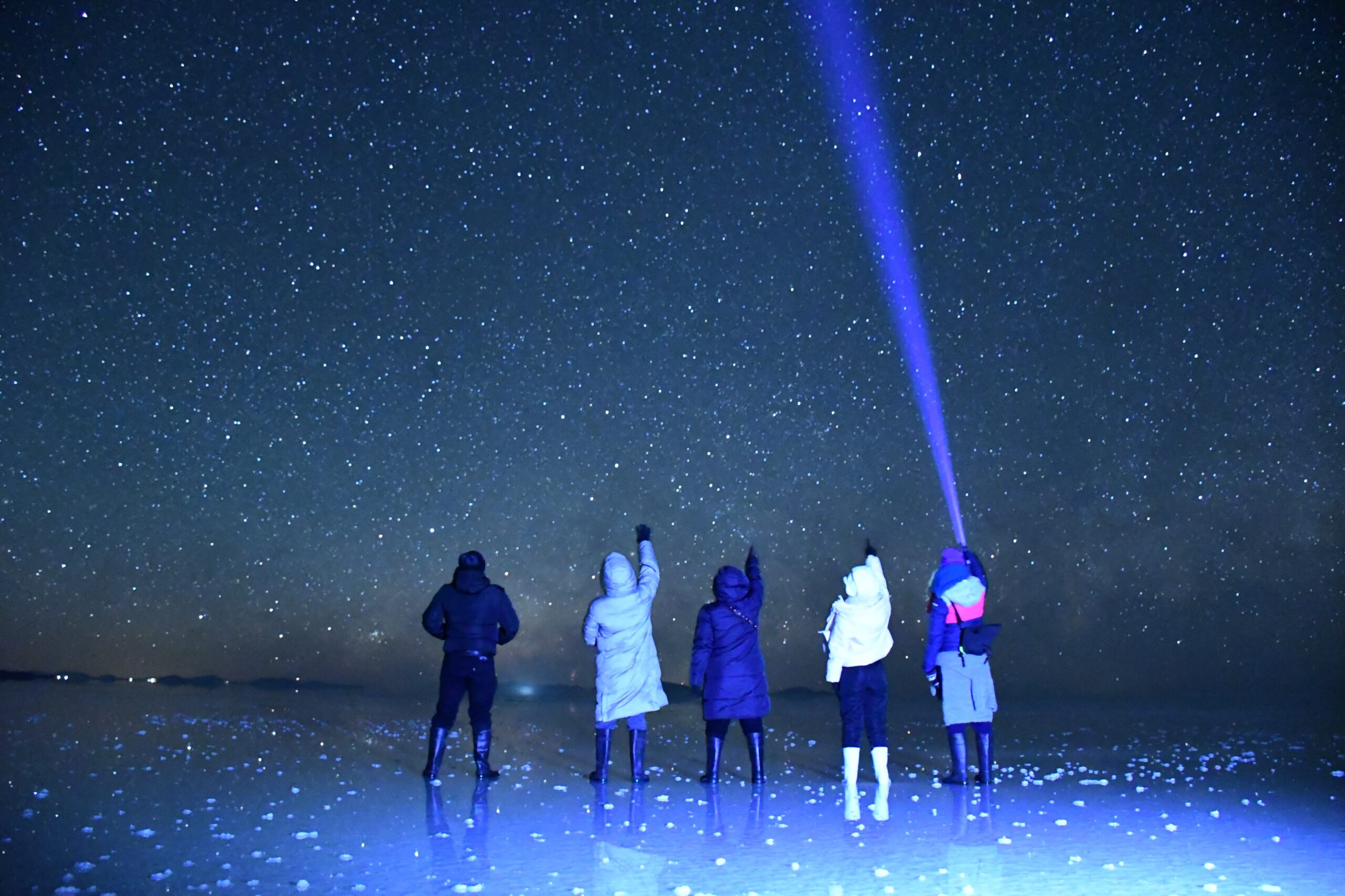 We use portable lights of different colors to illuminate the salt flat and create interesting visual effects for photographs, highlighting the texture of the salt and creating contrasts with the starry sky.